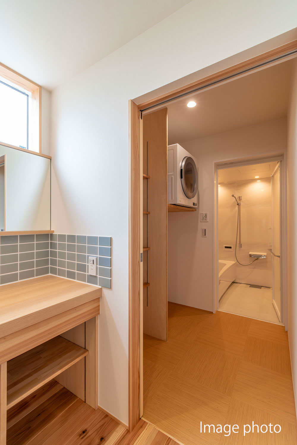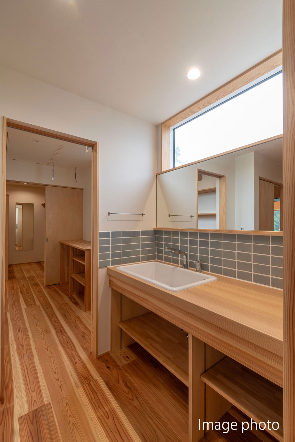 幹太くんや汚れものを洗うスロップシンク(底が深く大きい流し台)等、リビングから一直線の家事動線は、ゆとりある生活に繋がります。