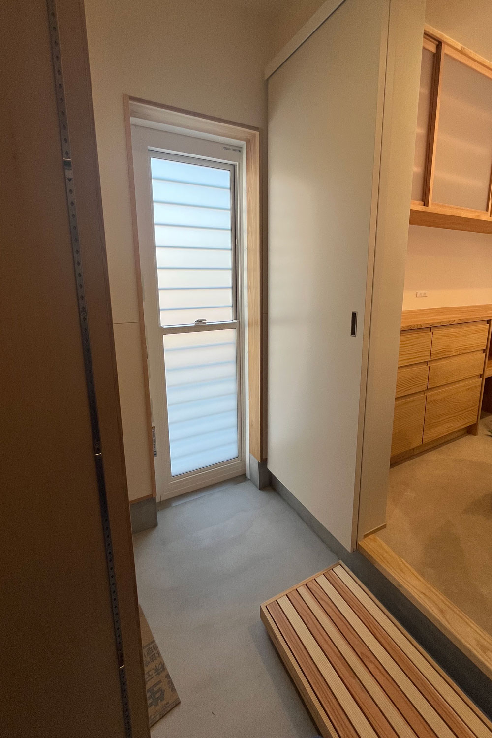 キッチン横の土間収納は勝手口があるため、車を横づけして様々なものを家の中に運び込むことができます。ストックしたい食材や、涼しい場所に保管したい野菜などをおいておく便利スペース。