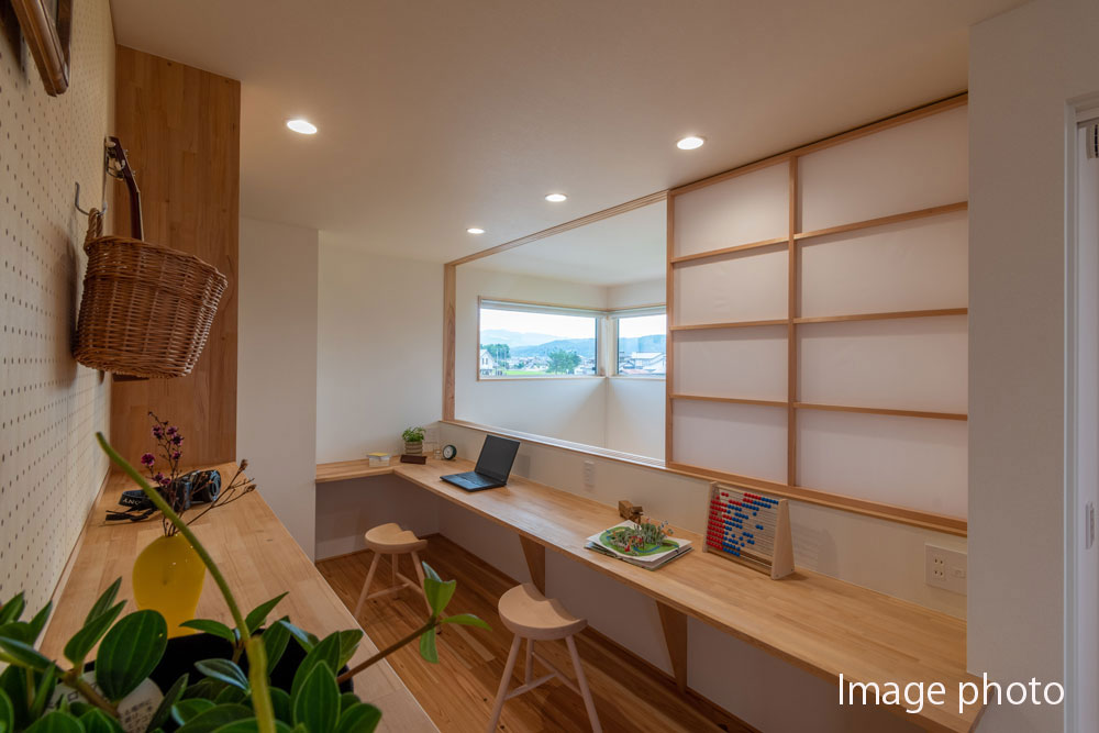 在宅ワークができる寝室横の書斎や、子供たちが広々一緒に勉強できるスタディコーナーまで、集中して取り組める場所が豊富。吹抜けの上にあるので、冬も薪ストーブであったか。