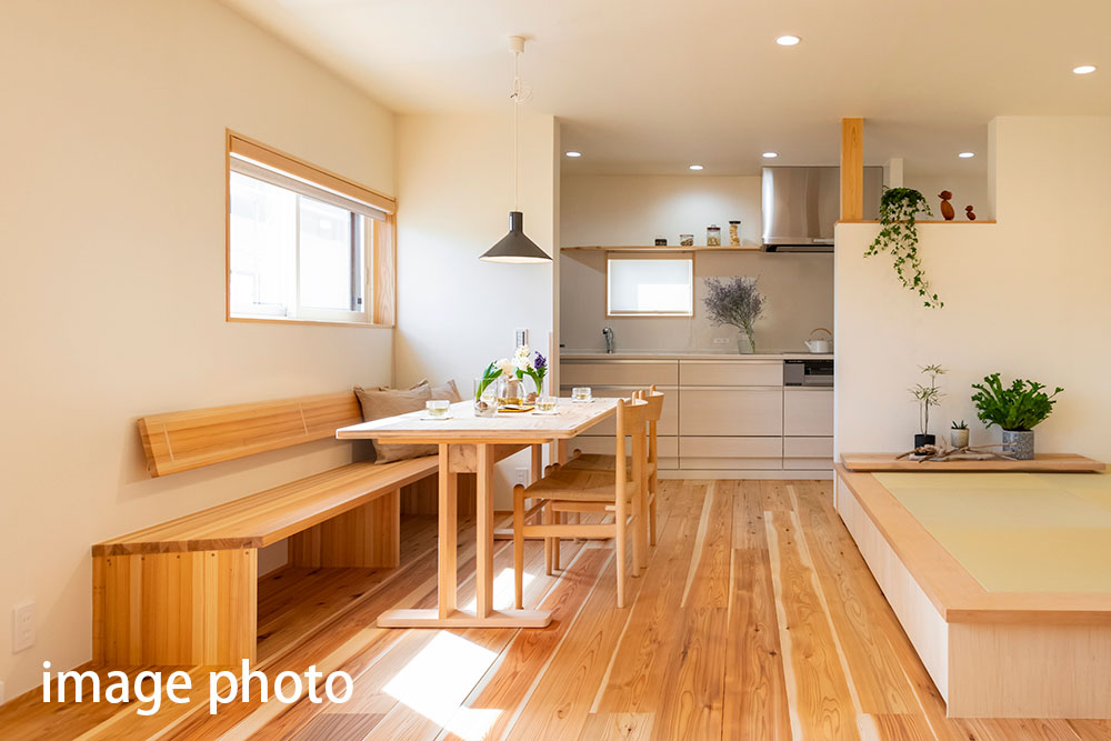 ◎たくさんの友人を招いて食事を楽しめる大きな造作ダイニングテーブルとベンチ。