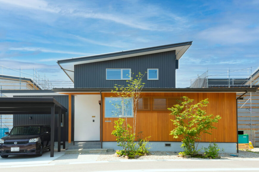 いぶし銀の板金と白い漆喰と木目の見える板張りのメリハリのある外観はお施主さまのお好みの配色。前面道路に面する洗面やトイレの引き違い窓には、目隠し格子を取り付け、風は通して外からの視線は遮ります。