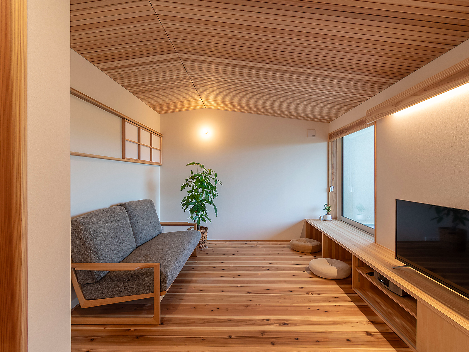通気断熱WB工法による空気の心地よさや、断熱・耐震性能、杉の無垢床や造作家具、細部まで丁寧に仕上げた住まいのつくり。