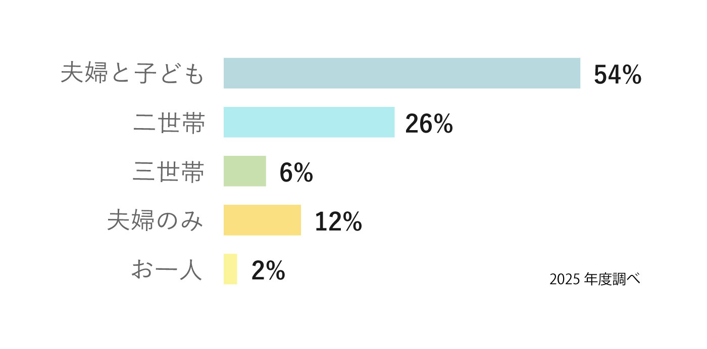 家事動線の観点から子育て世代に選ばれています。また、設計士が二世帯で暮らしていることもあり、ご家庭に合った暮らしの動線、ほどよい距離感、プライバシーに配慮が大切な二世帯、三世帯の方にも柔軟にご提案できます。
