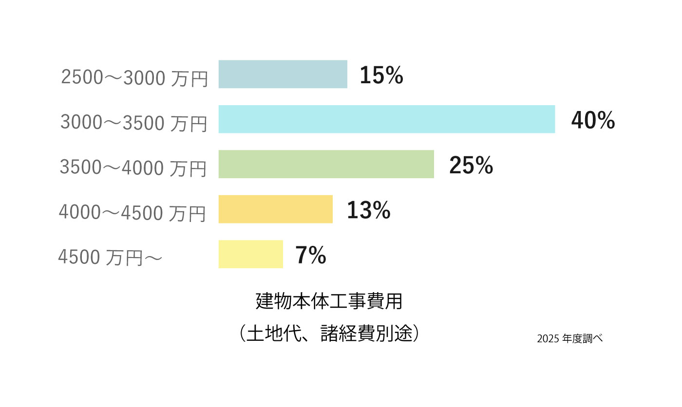 土地代、外構工事費用、付帯費用を除いて、3000〜3500万円が中心です。誠実な素材、確かな工法、大工の手仕事でお客さまのご予算、ご要望に合わせた家づくりをします。