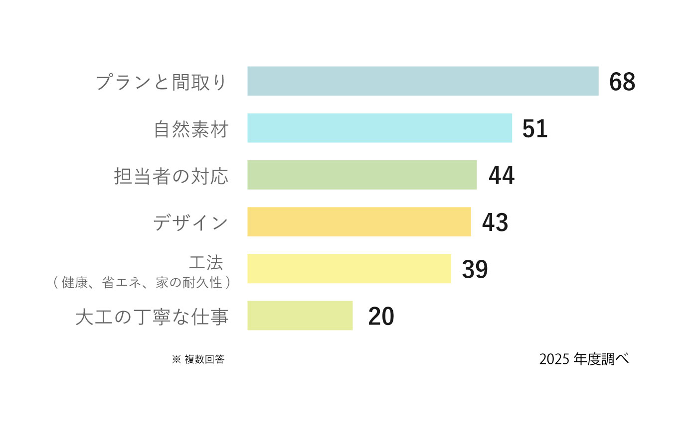 間取りや素材など、毎日の暮らしを快適にするポイントが上位に。こだわってつくる住宅だから「大工の丁寧な仕事も重視されています。
